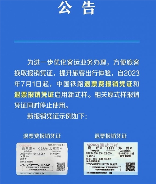 ·中國鐵路退票費(fèi)報(bào)銷憑證和退票報(bào)銷憑證啟用新式樣。