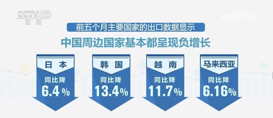 當(dāng)記者查閱主要國家前5個月的進口數(shù)據(jù)時發(fā)現(xiàn),主要國家進口額普遍下降,全球需求不振持續(xù)顯現(xiàn)。而前5個月主要國家的出口數(shù)據(jù)也顯示,中國周邊國家基本都呈現(xiàn)負(fù)增長,日本同比降6.4%、韓國同比降13.4%、越南同比降11.7%、馬來西亞同比降6.16%。