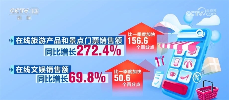 在線服務消費增勢較好。上半年,在線餐飲銷售額同比增長27.9%。在線旅游產(chǎn)品和景點門票、在線文娛銷售額同比分別增長272.4%和69.8%,比一季度分別加快156.6和50.6個百分點。