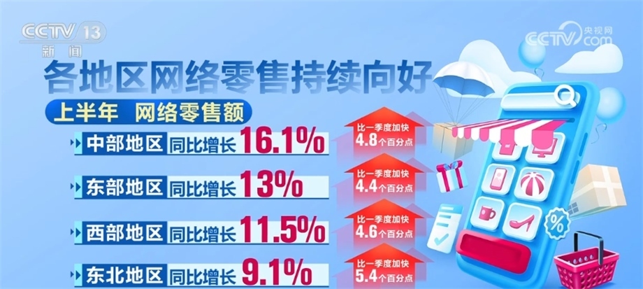 各地區(qū)網(wǎng)絡零售持續(xù)向好。上半年,中部、東部、西部和東北地區(qū)網(wǎng)絡零售額同比分別增長16.1%、13%、11.5%和9.1%,比一季度分別加快4.8、4.4、4.6和5.4個百分點。