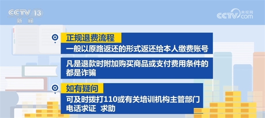 正規(guī)退費(fèi)流程一般以原路返還的形式返還給本人繳費(fèi)賬號(hào),凡是退款時(shí)附加購(gòu)買商品或支付費(fèi)用條件的都是詐騙。如有疑問(wèn),可及時(shí)撥打110或有關(guān)培訓(xùn)機(jī)構(gòu)主管部門(mén)電話求證、求助。