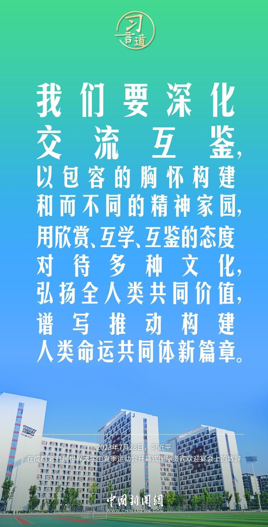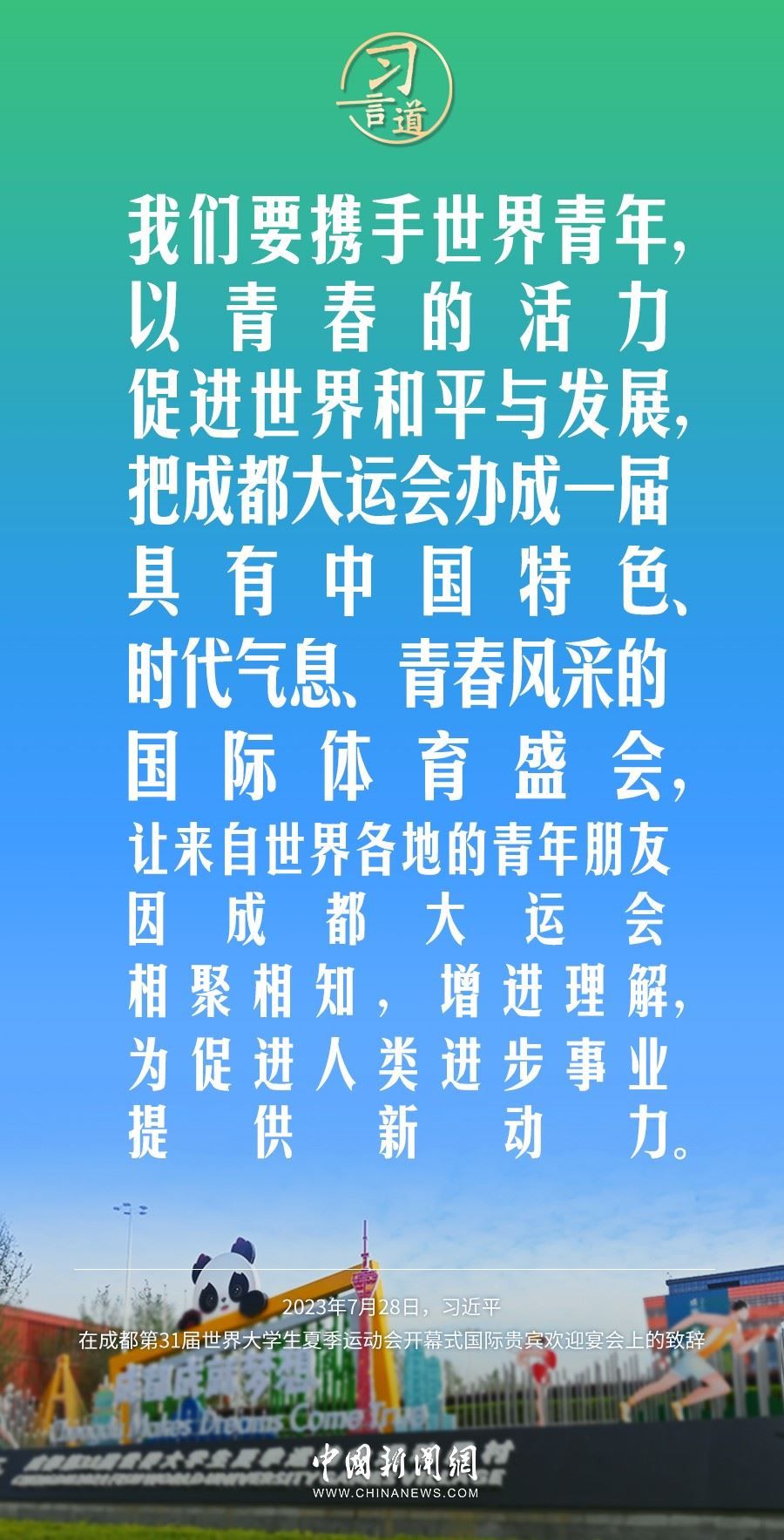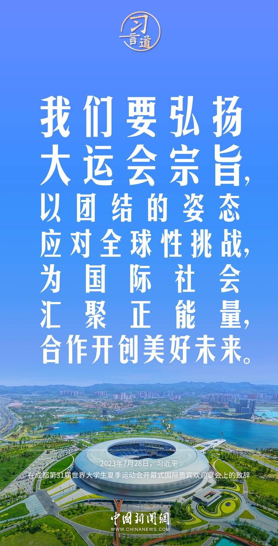 7月28日中午,國家主席習近平和夫人彭麗媛在四川省成都市金牛賓館舉行宴會,歡迎出席成都第31屆世界大學生夏季運動會開幕式的國際貴賓。習近平發(fā)表致辭稱——