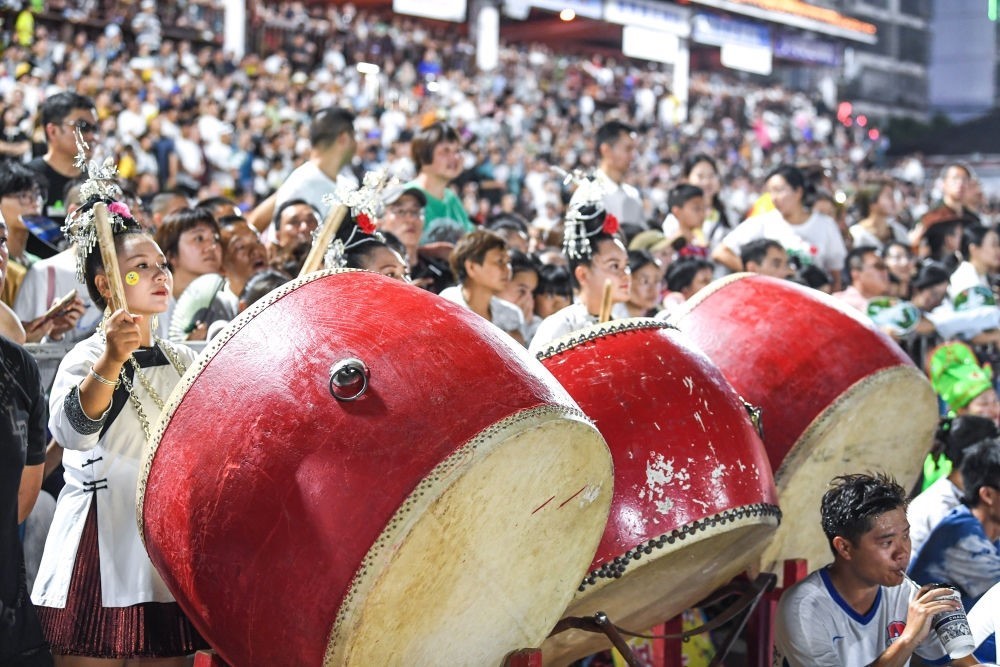 7月15日,拉拉隊(duì)在貴州“村超”足球賽場邊擊鼓助威。新華社記者 楊文斌 攝