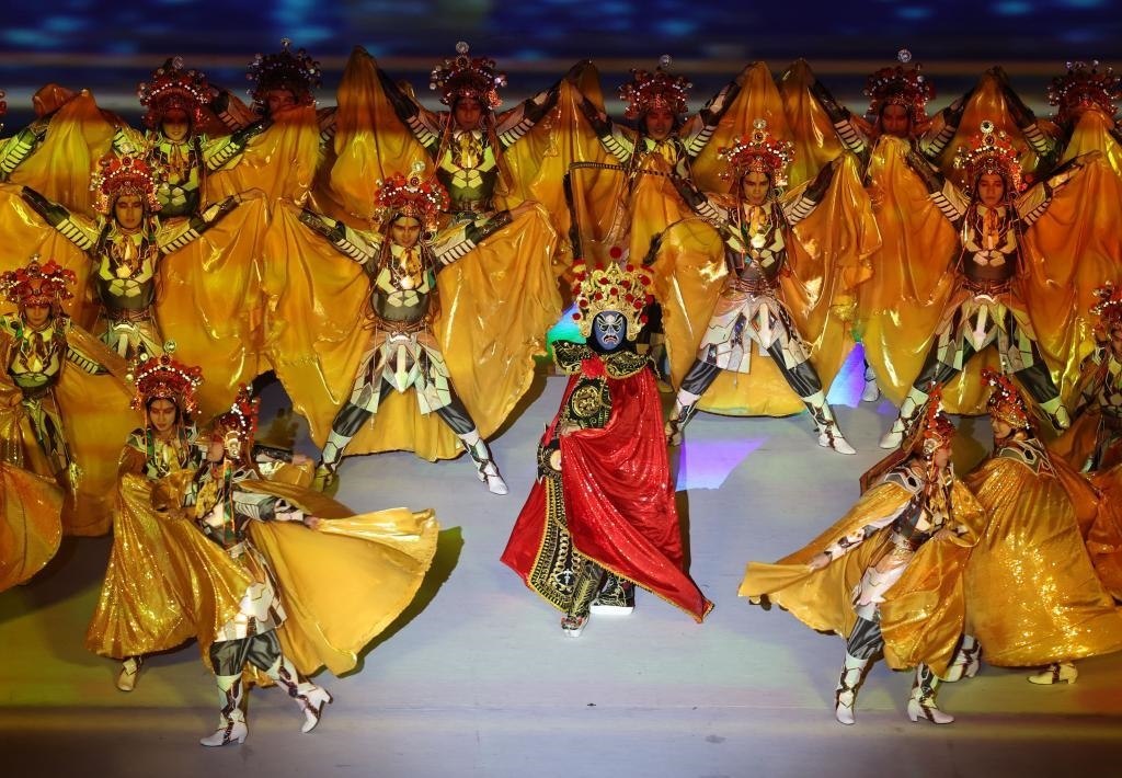 7月28日,演員在大運會開幕式上表演川劇變臉。新華社記者江宏景攝