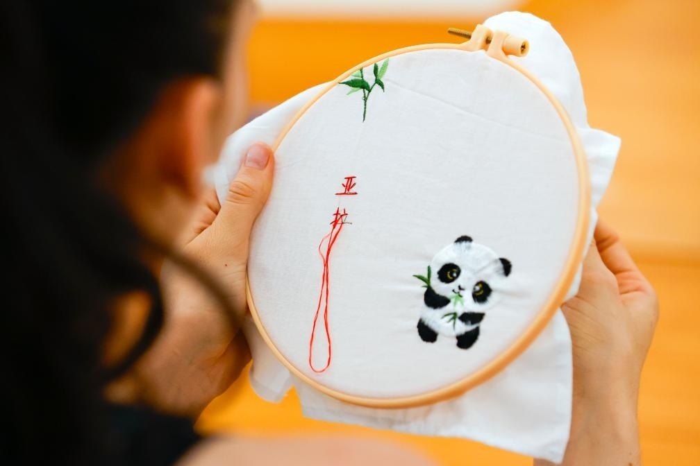 7月31日,成都大運村互動體驗中心,阿根廷運動員亞拉·納瓦羅體驗在蜀繡作品上繡上自己的中文名字。新華社記者沈伯韓攝