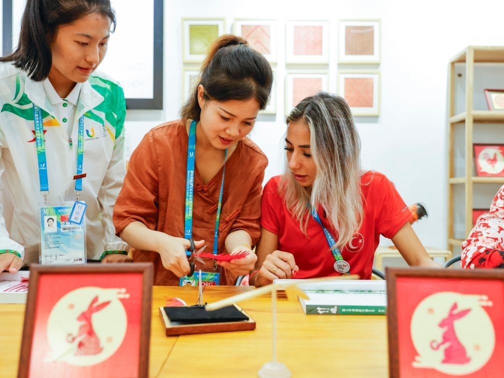 其中,非遺互動體驗是眾多文化活動的重頭戲。在大運村互動體驗中心,運動員和教練員在休息時間紛紛前來跟隨蜀繡、竹編、剪紙等非遺項目傳承人近距離了解中國非遺文化。