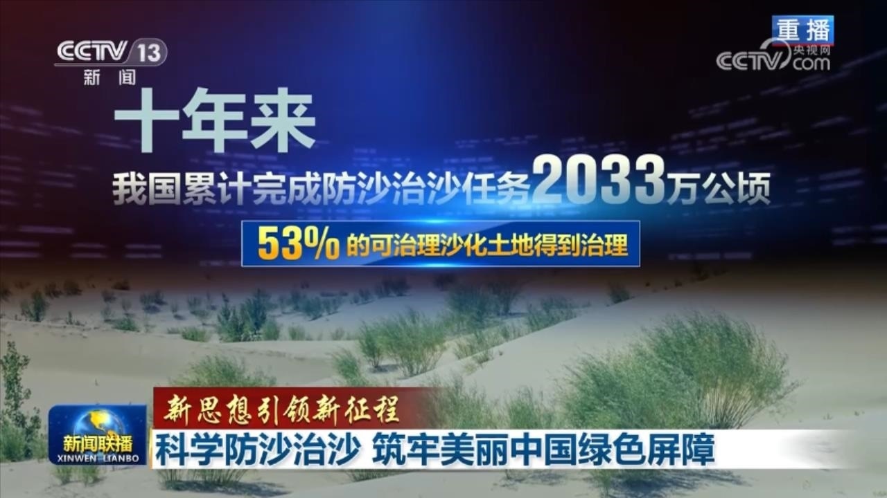 央視網(wǎng)消息(新聞聯(lián)播):習(xí)近平總書記強(qiáng)調(diào),加強(qiáng)荒漠化綜合防治,深入推進(jìn)“三北”等重點(diǎn)生態(tài)工程建設(shè),事關(guān)我國生態(tài)安全、事關(guān)強(qiáng)國建設(shè)、事關(guān)中華民族永續(xù)發(fā)展,是一項(xiàng)功在當(dāng)代、利在千秋的崇高事業(yè)。黨的十八大以來,我國多措并舉推進(jìn)荒漠化治理,防沙治沙取得巨大成就,進(jìn)一步筑牢美麗中國綠色屏障。