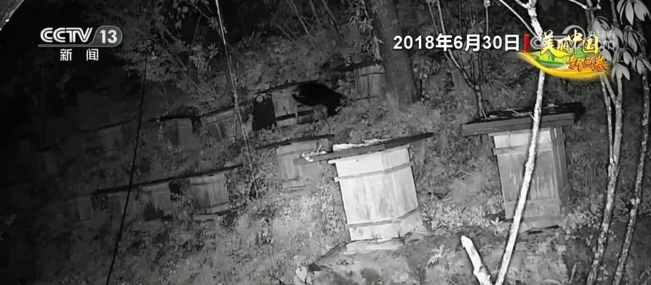 在湖北堵河源國家級自然保護(hù)區(qū),經(jīng)常會發(fā)生黑熊下山偷食百姓的莊稼、蜂蜜等農(nóng)產(chǎn)品。記者通過當(dāng)?shù)匾晃淮迕裉峁┑囊曨l看到,2018年晚上一頭成年黑熊來到一蜂箱放置點(diǎn),黑熊為了取食蜂蜜推倒了一箱蜂箱,并啃食了幾口蜂蜜。
