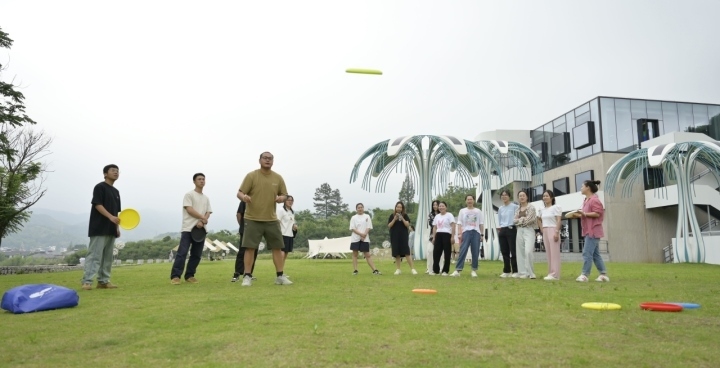 在安吉余村鄉(xiāng)村圖書館前,年輕人在草坪上玩飛盤。圖片來(lái)源:新華社