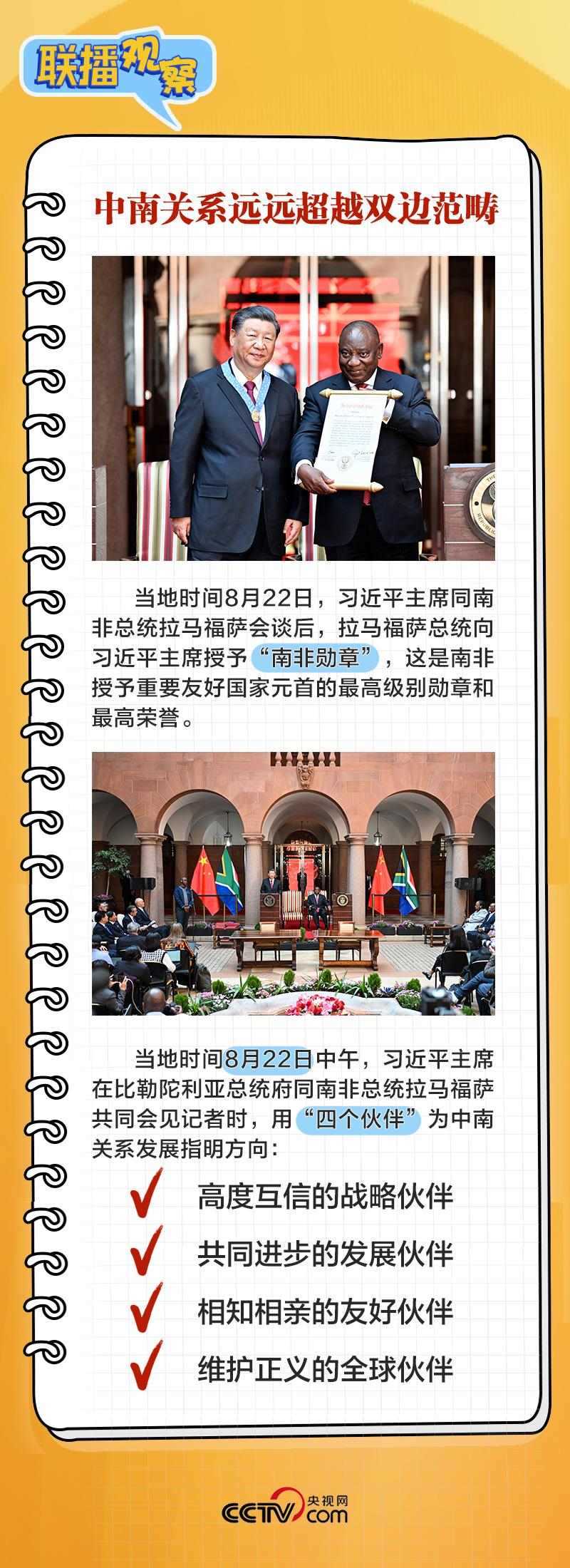 8月22日上午,在同南非總統(tǒng)拉馬福薩舉行會(huì)談時(shí),習(xí)主席表示:“中南關(guān)系之所以好、中南友誼之所以深,關(guān)鍵在于兩國(guó)兩黨在各自發(fā)展道路上休戚與共,結(jié)下了同志加兄弟的深厚友誼?!?/p>