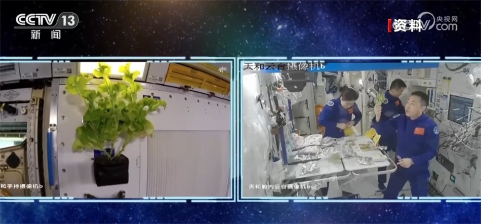 這就是被稱為“太空菜園”的太空栽培裝置,該裝置是中國航天員科研訓練中心科研人員設計的一種模塊化的簡易太空植物栽培裝置,采用開放式結構,航天員可以與植物隨時親密接觸。植物生長所需要的二氧化碳、溫濕度和氧氣等氣體環(huán)境和艙內(nèi)航天員基本一致,植物種植操作簡單,便于照料。航天員還可按個人喜好將該裝置任意擺放在艙內(nèi)有光照的地方,為自己的工作生活環(huán)境增添一抹綠意。這次種植的生菜得到科學配置的光照和水分,在太空環(huán)境下也長勢喜人。