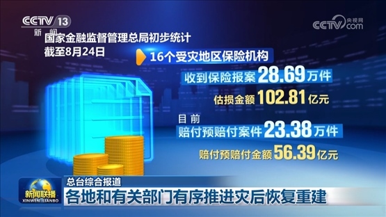 國家金融監(jiān)督管理總局初步統(tǒng)計,截至8月24日,16個受災(zāi)地區(qū)保險機構(gòu)收到保險報案28.69萬件,估損金額102.81億元。目前賠付預(yù)賠付案件23.38萬件,賠付預(yù)賠付金額56.39億元。