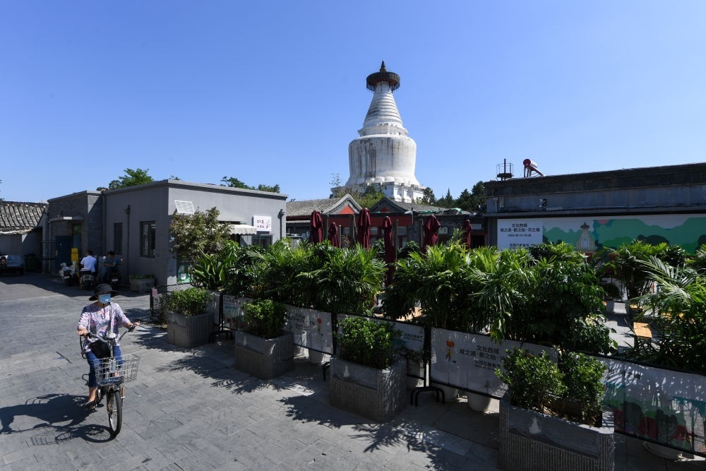 午后的北京西城區(qū)宮門口西岔胡同,居民們納涼聊天,一間間老字號燒餅店、特色咖啡廳、精釀啤酒館各成風(fēng)景。抬頭望去,青磚灰瓦與紅墻綠樹之上,妙應(yīng)寺白塔莊重滄桑,古樸與現(xiàn)代相映成趣。