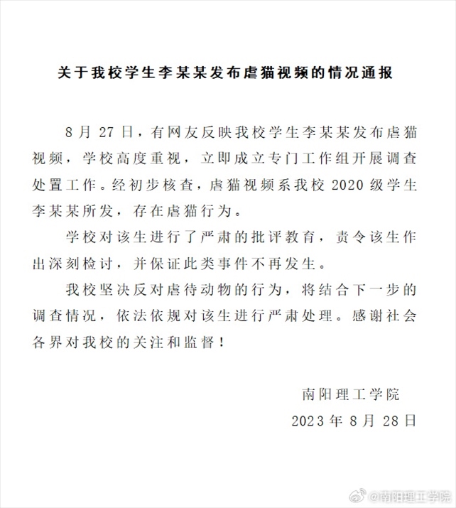 ·南陽(yáng)理工學(xué)院通報(bào)“學(xué)生發(fā)布虐貓視頻”:責(zé)令其作出深刻檢討,將進(jìn)行嚴(yán)肅處理。