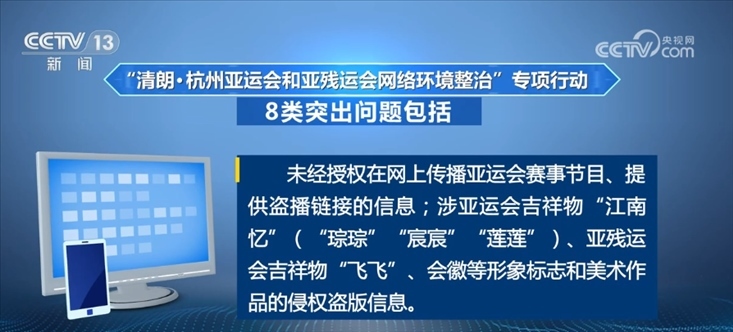 未經(jīng)授權(quán)在網(wǎng)上傳播亞運(yùn)會賽事節(jié)目、提供盜播鏈接的信息;涉亞運(yùn)會吉祥物“江南憶”(“琮琮”“宸宸”“蓮蓮”)、亞殘運(yùn)會吉祥物“飛飛”、會徽等形象標(biāo)志和美術(shù)作品的侵權(quán)盜版信息。