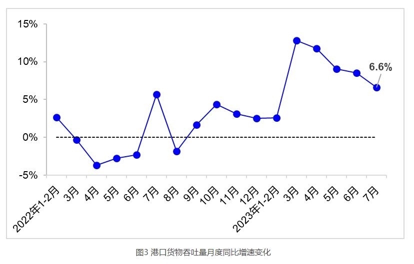 7月,全國港口完成貨物吞吐量14.3億噸,同比增長6.6%,其中內、外貿吞吐量分別增長5.8%和8.5%。完成集裝箱吞吐量2705萬標箱,同比增長2.6%。
