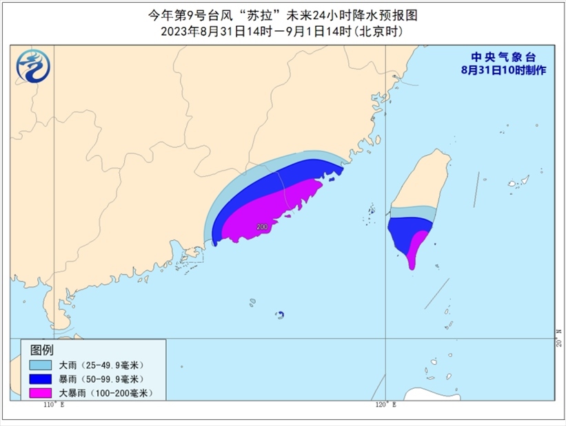 降水預(yù)報(bào):8月31日14時(shí)至9月1日14時(shí),廣東東部、福建南部、臺(tái)灣島中南部等地的部分地區(qū)有大到暴雨,其中,廣東東南部、福建東南部、臺(tái)灣島東南部等地部分地區(qū)有大暴雨(100-200毫米)。