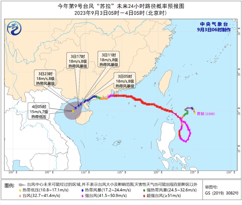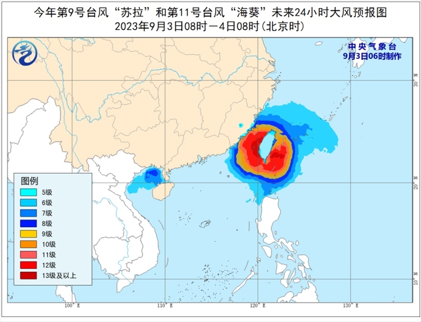 大風預報:9月3日08時至4日08時,受“蘇拉”影響,北部灣、瓊州海峽以及廣西南部沿海、海南島北部沿海等地將有6-7級大風,其中北部灣部分海域將有8級、陣風9-10級的大風;受“??庇绊懀褪亢{、臺灣海峽、臺灣以東洋面、東海南部及釣魚島附近海域以及浙江南部沿海、福建沿海、臺灣島沿海將有6-8級、陣風9-10級大風,部分海域或地區(qū)的風力有9-12級,陣風13-14級,“??敝行慕涍^的附近海面或地區(qū)的風力有13-16級,陣風17級。