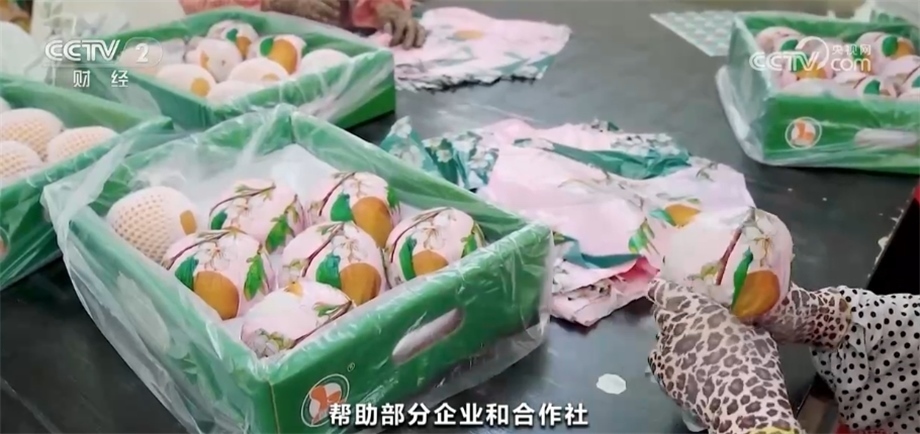在當(dāng)?shù)匾患液献魃?,記者看到,工人們正在分揀果子,套袋裝箱,這些秋月梨將銷往全國(guó)各地。