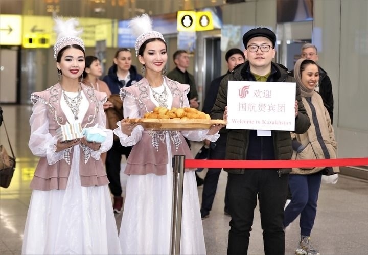 4月21日,在哈薩克斯坦首都阿斯塔納的納扎爾巴耶夫國際機場,哈方工作人員為搭乘國航北京-西安-阿斯塔納航線首班飛機抵達的旅客舉行歡迎儀式。