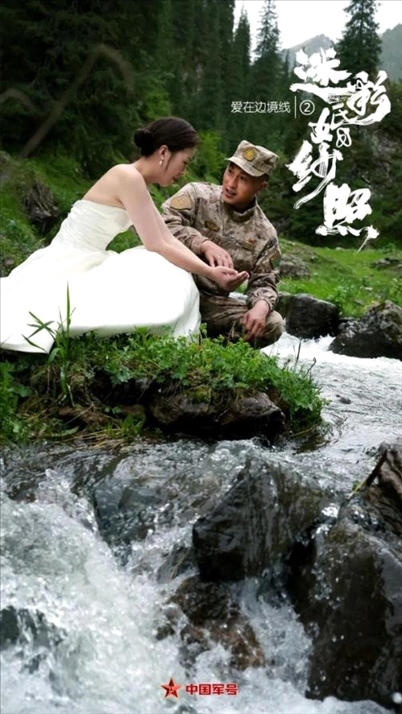 陳健駐守在新疆軍區(qū)紅海溝邊防連,與妻子丁佳結(jié)婚8年,聚少離多,一直遺憾沒有拍過婚紗照。妻子丁佳決定給他一個驚喜——帶上婚紗,跨越幾千公里,在他巡邏的路上與他“偶遇”!迷彩婚紗照又有“天花板”了!