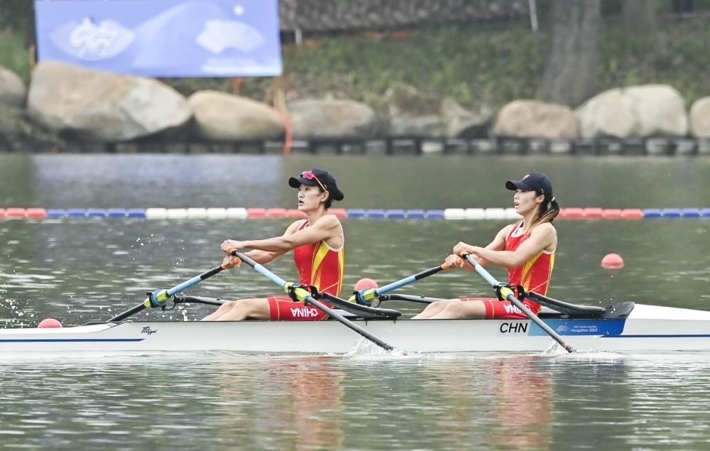 9月24日,在杭州亞運(yùn)會(huì)賽艇女子輕量級(jí)雙人雙槳決賽中,中國組合鄒佳琪/邱秀萍以7分06秒78的成績奪得冠軍,斬獲本屆亞運(yùn)會(huì)首金。這是鄒佳琪(右)/邱秀萍在決賽中。新華社記者 江漢 攝