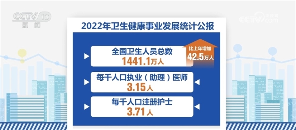 《公報》顯示,我國醫(yī)療衛(wèi)生資源總量繼續(xù)增加。到2022年末,全國醫(yī)療衛(wèi)生機構(gòu)達到1032918個,比上年增加1983個。全國共設(shè)置13個類別的國家醫(yī)學(xué)中心和兒童類別的國家區(qū)域醫(yī)療中心。全國醫(yī)療衛(wèi)生機構(gòu)床位975.0萬張,每千人口醫(yī)療衛(wèi)生機構(gòu)床位數(shù)由2021年的6.70張增加到2022年的6.92張。全國衛(wèi)生人員總數(shù)1441.1萬人,比上年增加42.5萬人。每千人口執(zhí)業(yè)(助理)醫(yī)師3.15人,每千人口注冊護士3.71人。