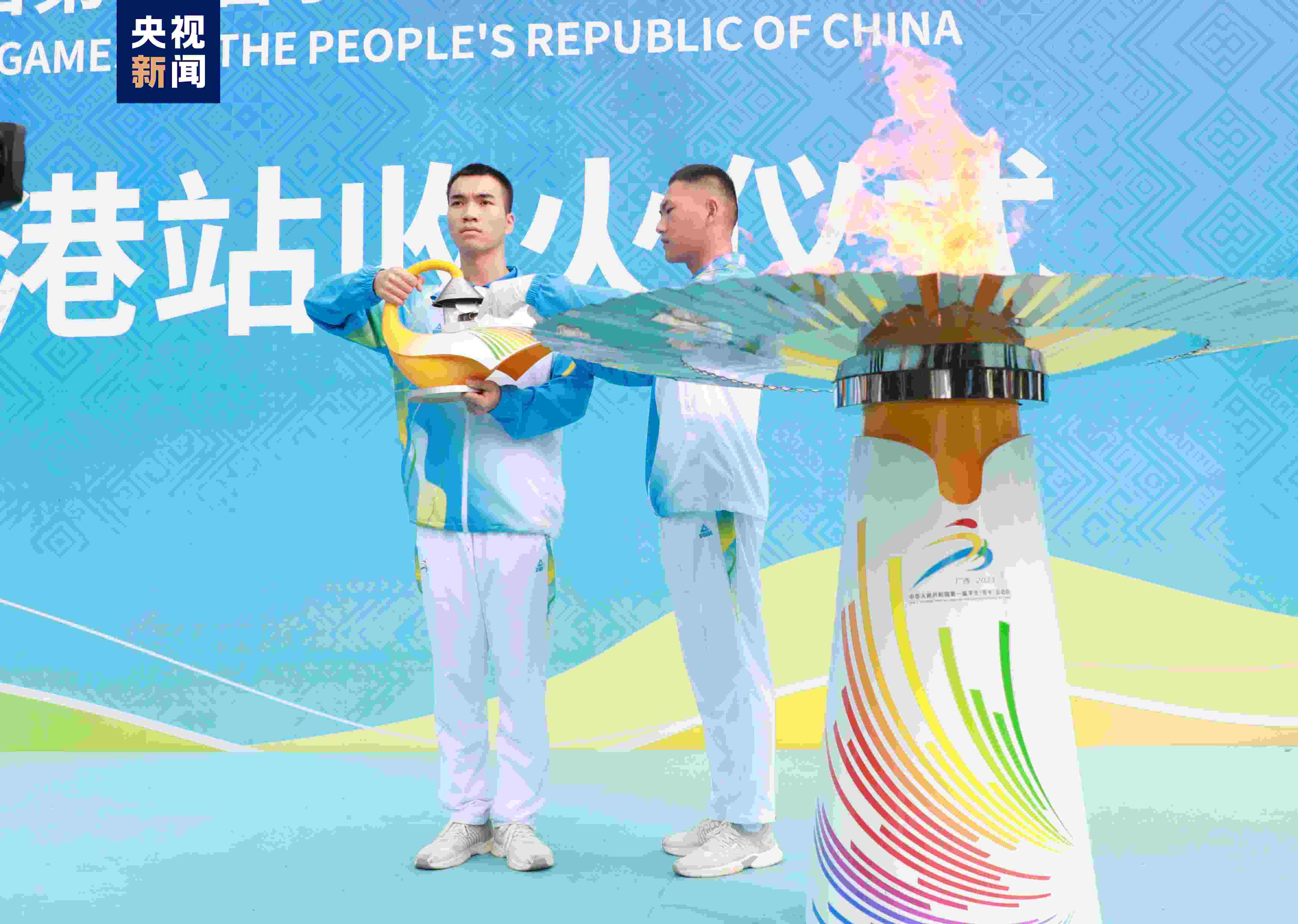 最后一棒火炬手完成最后100米接力后,用火炬點(diǎn)燃圣火盆,隨后火種護(hù)衛(wèi)引回火種,這也標(biāo)志著首屆學(xué)青會(huì)火炬?zhèn)鬟f在貴港完成傳遞,將奔赴下一站——南寧。