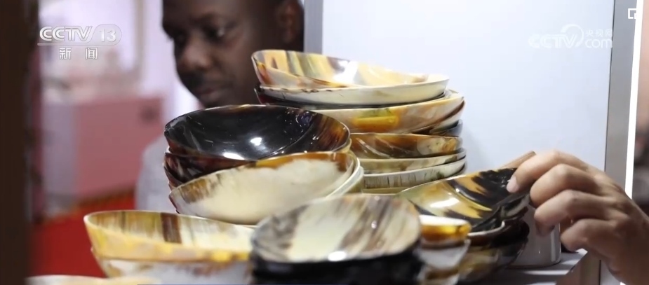 不僅是“回頭客”收獲滿滿,“頭回客”烏干達商人蒂莫西表示感到十分驚喜。他是第一次來參展,只拿到了3層貨架的展位。但是,來自烏干達的牛角梳等牛角手工藝品,吸引了不少訪客駐足詢問。