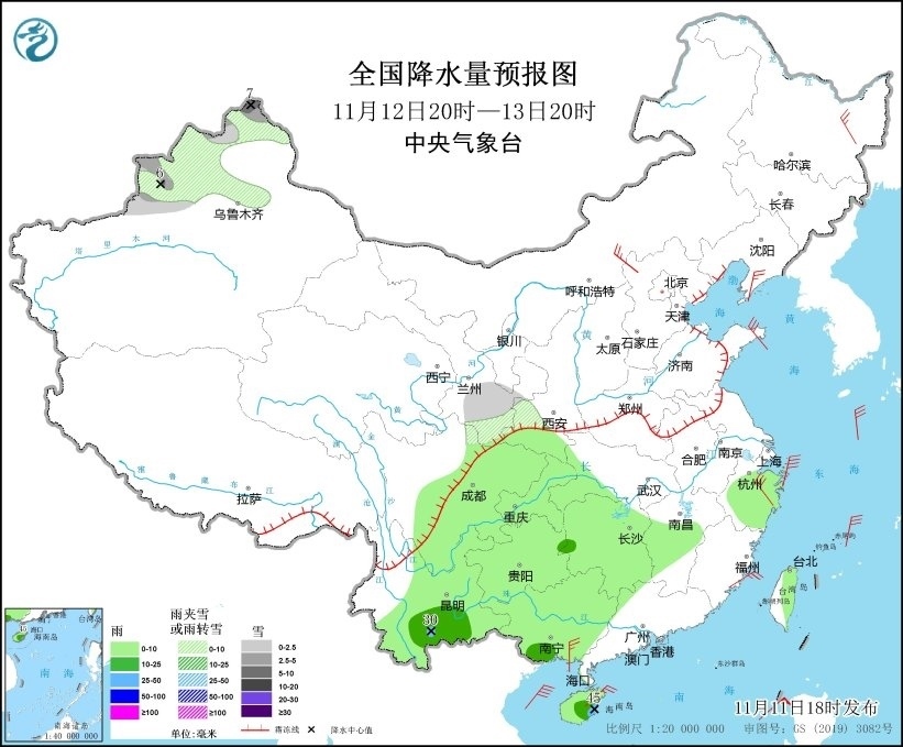 圖4 全國降水量預報圖(11月11日20時-12日20時)