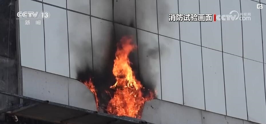 為了真實(shí)模擬高層保溫層火災(zāi)特性,消防滅火無(wú)人機(jī)噴射一分鐘高壓液體后就停止作業(yè)。此時(shí),過火鋁塑板周邊縫隙還不斷有黑煙冒出,大約2分鐘后,這些鋁塑板的縫隙里開始出現(xiàn)明火,這就意味著鋁塑板下層的保溫層泡沫出現(xiàn)了復(fù)燃,與此同時(shí),滴落在下方平臺(tái)上的泡沫殘?jiān)查_始復(fù)燃。5分鐘后,表層的鋁塑板被燒開,露出保溫層的熊熊火焰,同時(shí)與底部復(fù)燃的火焰上下貫通,外墻裝飾材料開始更為猛烈的燃燒,大量的裝飾材料被點(diǎn)燃,直接砸向地面或者四處飄落,火災(zāi)有進(jìn)一步擴(kuò)大的風(fēng)險(xiǎn)。