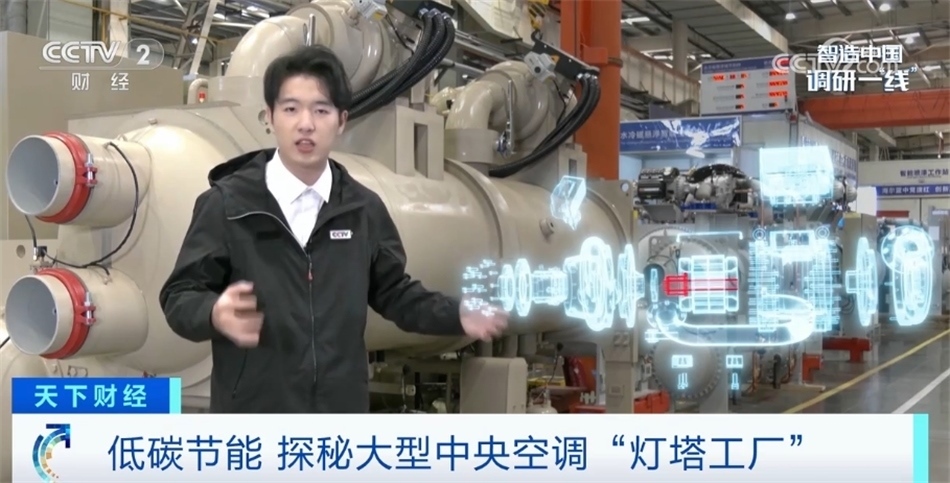 總臺央視記者 吳柏辰:今天我們來到的是位于山東青島的一家生產(chǎn)中央空調(diào)的“燈塔工廠”,這里生產(chǎn)的空調(diào)跟我們平時家用的不一樣,我身邊這樣的大家伙就是一臺商用中央空調(diào)的主機(jī)。要知道一棟寫字樓或者商場,空調(diào)制冷和制熱的能耗往往能能夠占到整體能耗的60%以上。這種大型空調(diào)如何用最少的電獲得最大的制冷或制熱效果?關(guān)鍵就在于空調(diào)主機(jī)的壓縮機(jī),我們可以看到在這臺空調(diào)頂端的這個白色裝置氣懸浮壓縮機(jī),它采用的就是一種空氣動力學(xué)技術(shù)。就像我們熟知的飛機(jī)機(jī)翼通過上下空氣流動的速度不同所產(chǎn)生的浮力,它就運(yùn)用了同樣的原理。