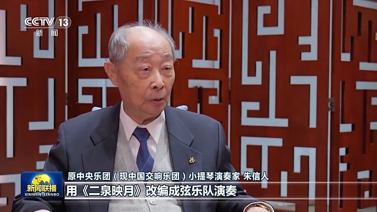 原中央樂團(現(xiàn)中國交響樂團)小提琴演奏家 朱信人:1973年我們是用《二泉映月》改編成弦樂隊演奏,他們聽了以后非常喜歡這首作品,當場就要總譜,他們準備演。他們也看了我們的樂器,有的當場就把自己的小號送給我們了。音樂大家都是融合的。