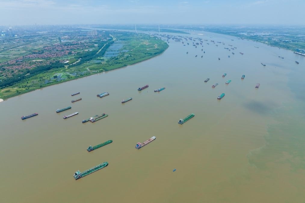 7月5日,船舶在武漢陽(yáng)邏港區(qū)水域行駛(無(wú)人機(jī)照片)。新華社記者伍志尊 攝