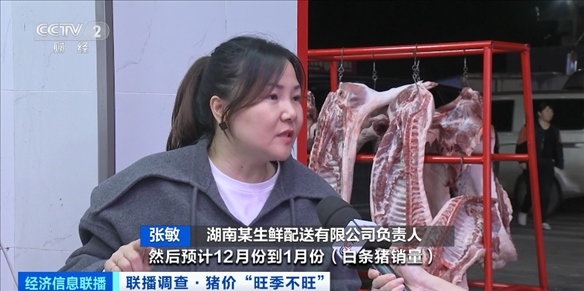 湖南某生鮮配送有限公司負(fù)責(zé)人 張敏:10月份到11月份(每天銷量)是450頭到600頭。預(yù)計12月份到1月份(白條豬銷量)會增長到一天800頭到1000頭。