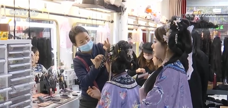這股國潮風(fēng)也帶動了南京漢服的租賃、妝造等周邊產(chǎn)業(yè),離老門東很近的剪子巷,500米左右的巷子就有20家左右的漢服租賃店。