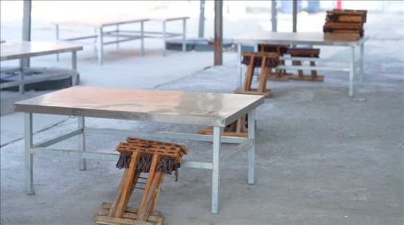 在一個(gè)汽車修理廠大院里,有一家露天燒烤店,夏天營(yíng)業(yè),冬天停業(yè)。