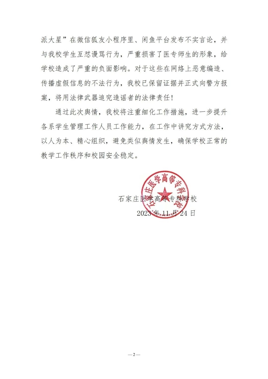 央視網(wǎng)消息:近日,網(wǎng)傳石家莊醫(yī)學(xué)高等??茖W(xué)校檢查學(xué)生宿舍,并將沒(méi)收來(lái)的物品掛在二手平臺(tái)咸魚上出售,事件引發(fā)關(guān)注。11月24日,石家莊醫(yī)學(xué)高等??茖W(xué)校發(fā)布聲明稱,22日學(xué)校利用學(xué)生在宿舍時(shí)間,排查大功率違規(guī)電器。查獲違規(guī)電器分別由各系登記造表、統(tǒng)一保管,定于放寒假時(shí)返還學(xué)生帶回家。經(jīng)核實(shí),網(wǎng)傳短視頻實(shí)為學(xué)生準(zhǔn)備去實(shí)習(xí)一起收拾房間物品時(shí)的視頻,被別有用心人員移花接木、惡意引用。此外,網(wǎng)名為“林北我叫派大星”在微信狐友小程序里、閑魚平臺(tái)發(fā)布不實(shí)言論,并與學(xué)校學(xué)生互懟謾罵行為,嚴(yán)重?fù)p害了醫(yī)專師生的形象,給學(xué)校造成了嚴(yán)重的負(fù)面影響。學(xué)校已保留證據(jù)并正式向警方報(bào)案。