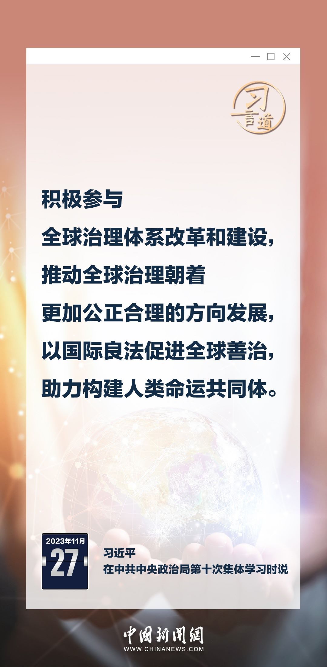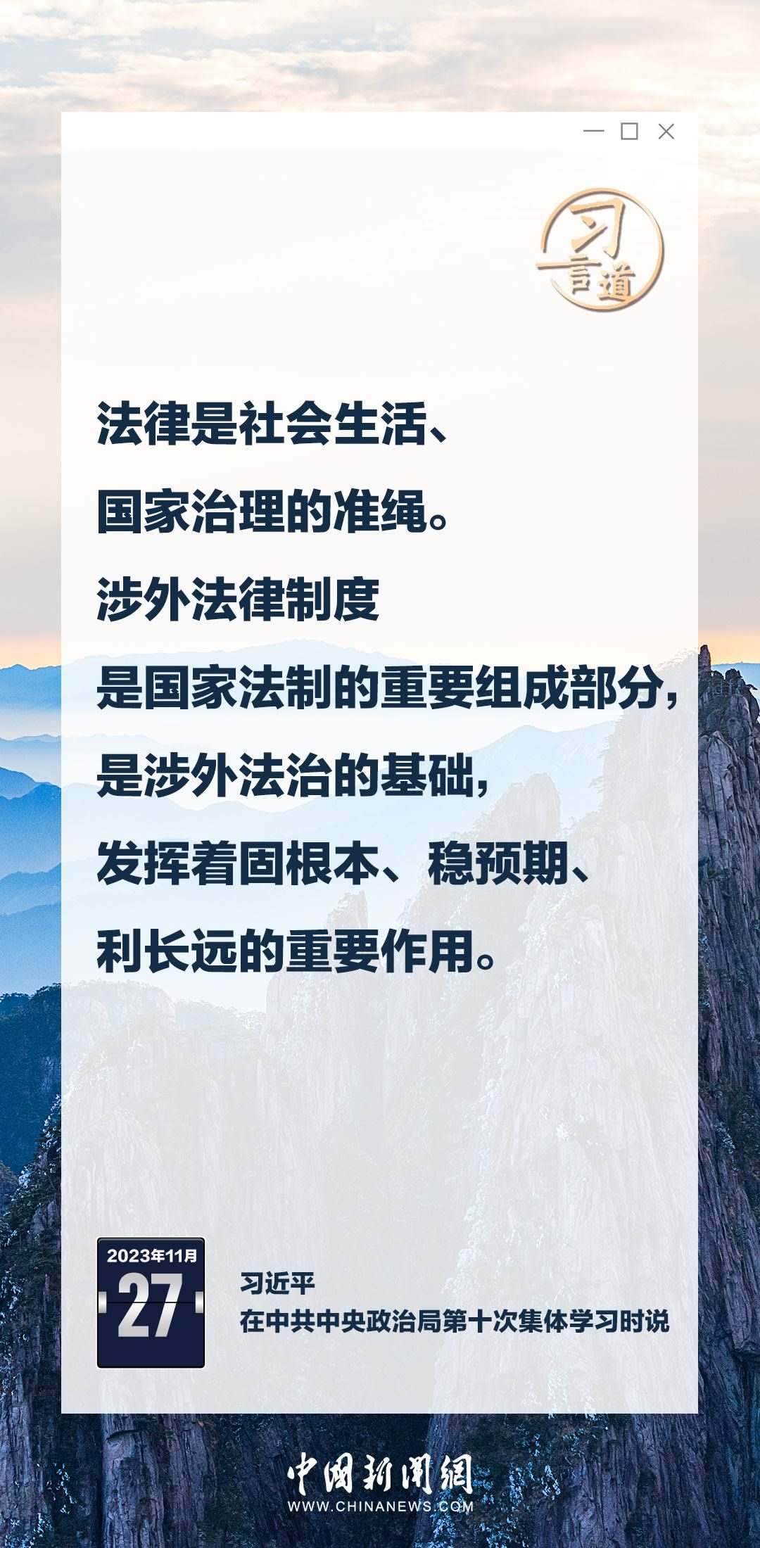 中共中央政治局11月27日下午就加強(qiáng)涉外法制建設(shè)進(jìn)行第十次集體學(xué)習(xí)。中共中央總書記習(xí)近平在主持學(xué)習(xí)時強(qiáng)調(diào)——