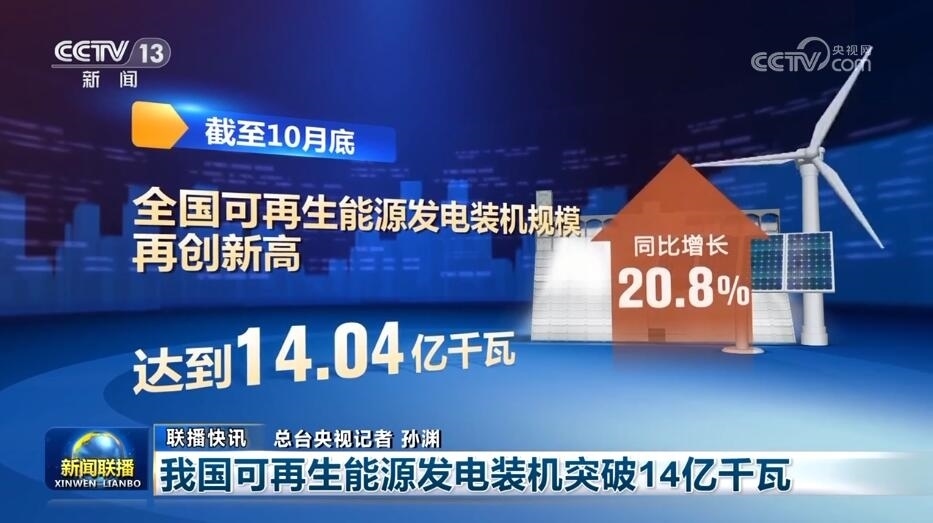 國家能源局發(fā)布數(shù)據(jù)顯示,截至10月底,全國可再生能源發(fā)電裝機規(guī)模再創(chuàng)新高,達到14.04億千瓦,同比增長20.8%,約占全國發(fā)電總裝機的49.9%。