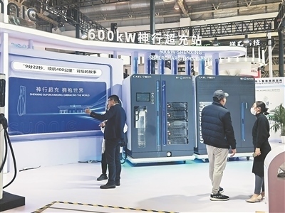 圖③ 首屆鏈博會上展示的大功率超充站。本報記者 洪星攝
