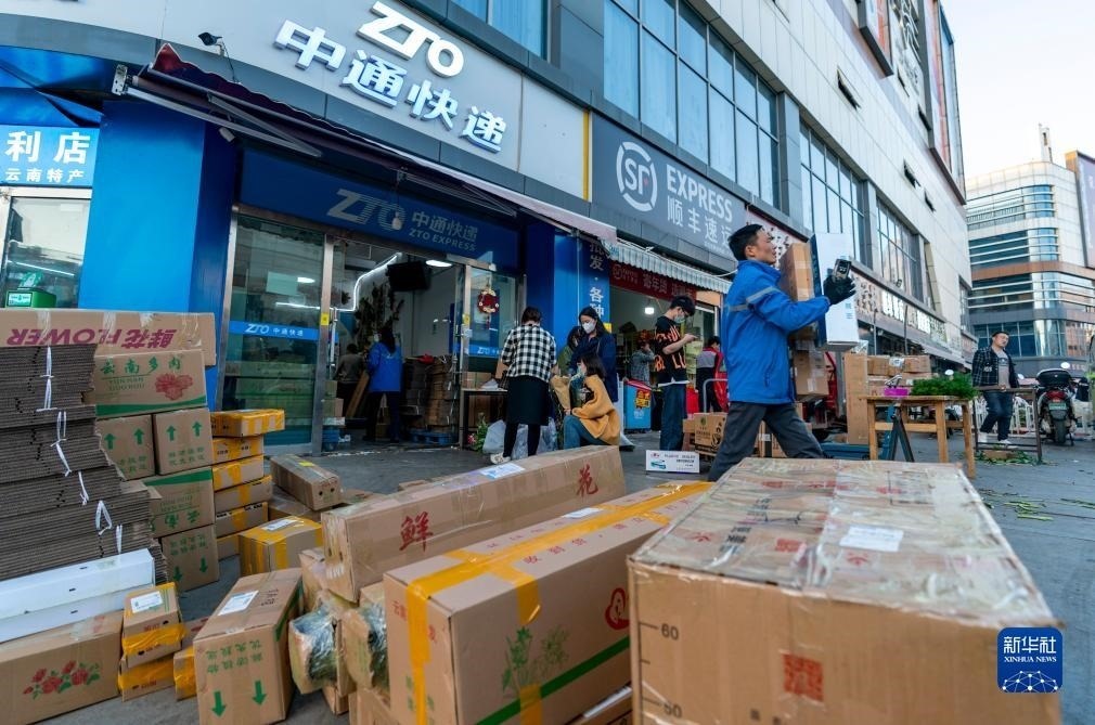 一名快遞工作人員在昆明斗南花市搬運打包好的鮮花(2023年1月31日攝)。新華社記者 陳欣波 攝