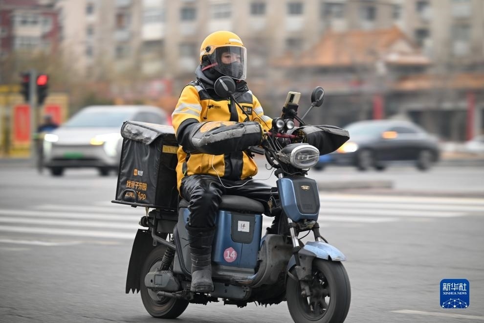 12月12日,在天津市南開(kāi)區(qū),外賣騎手身著御寒裝備在送餐途中。