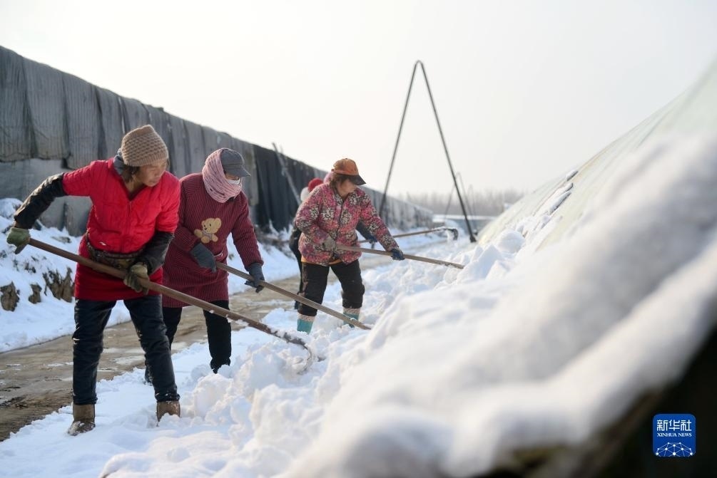 12月11日,在河北省石家莊市欒城區(qū)崗頭村,種植戶在清理大棚上的積雪。