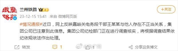 ·網(wǎng)傳國鐵蘭州局干部與女下屬存不正當(dāng)關(guān)系,官方:紀(jì)檢部門正調(diào)查核實(shí)。