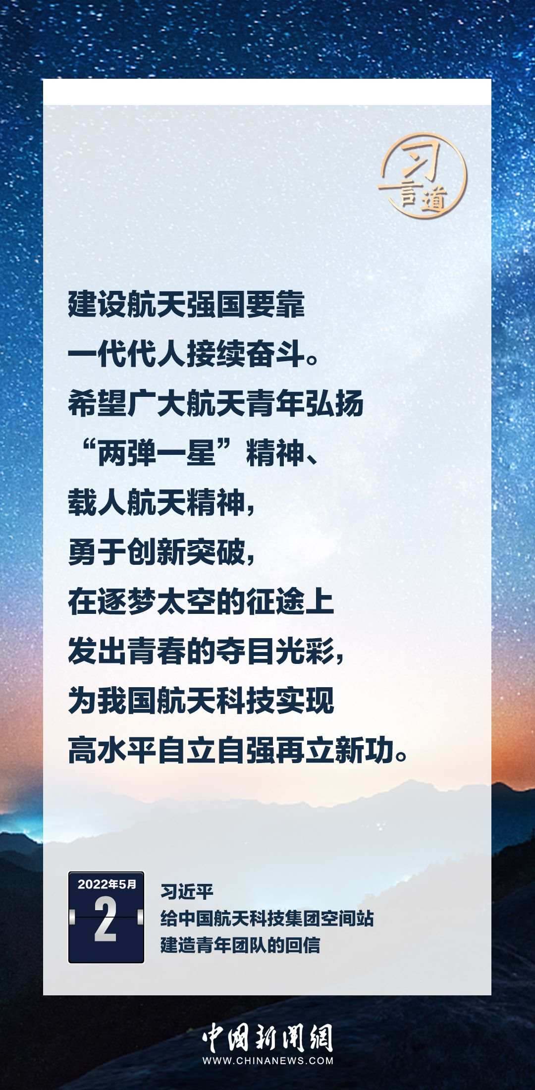 建設航天強國要靠一代代人接續(xù)奮斗。在不同場合,習近平總書記頻頻提及航天精神,激勵一代代中國人不斷奮進、筑夢太空。
