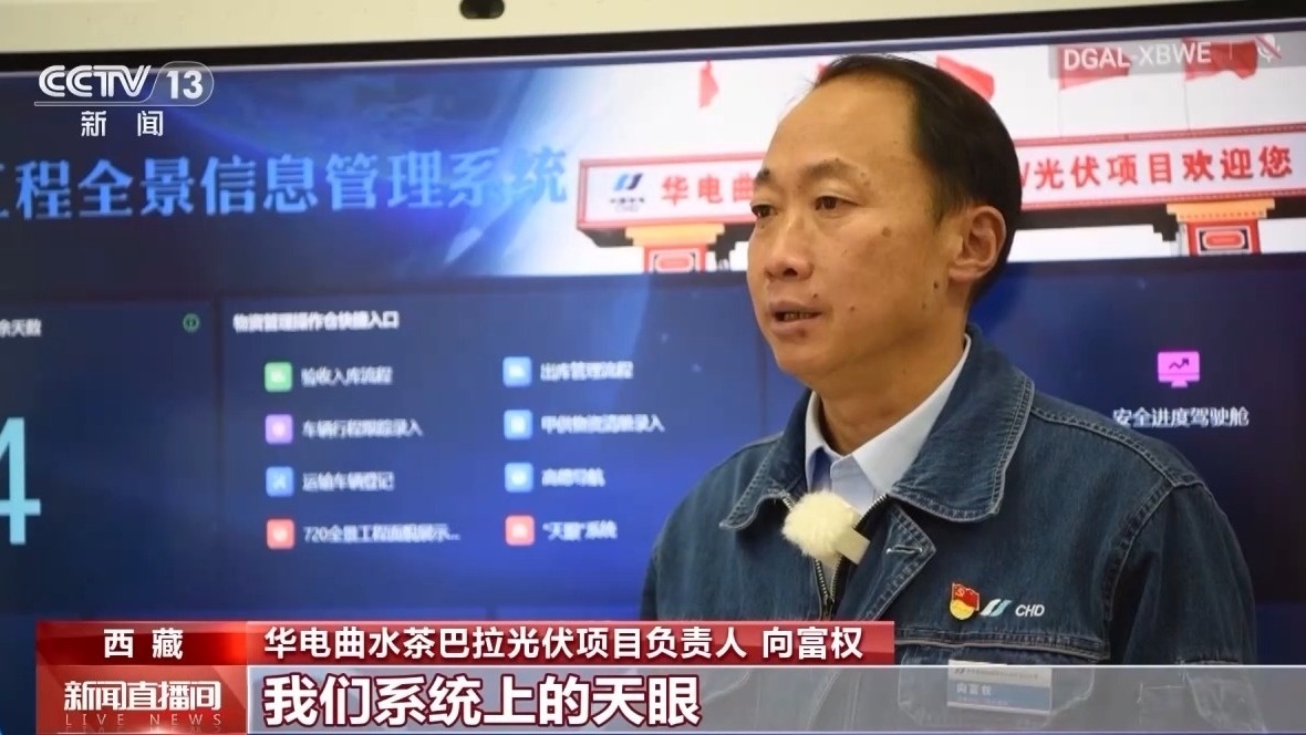 華電曲水茶巴拉光伏項目負(fù)責(zé)人 向富權(quán):系統(tǒng)涵蓋現(xiàn)場管控、物資供應(yīng)、資源投入等工程管理核心關(guān)鍵要素,管理人員可以實時掌控工程關(guān)鍵要素信息,還可以幫助工作人員及時消除異常狀況和管控風(fēng)險。