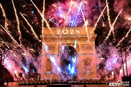 當地時間2024年1月1日,法國巴黎舉行新年慶?;顒樱瑒P旋門前燃放煙花。