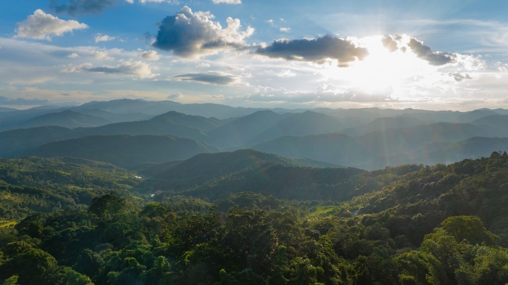 這是2023年9月16日拍攝的日落時(shí)分的云南普洱景邁山風(fēng)光(無人機(jī)照片)。新華社記者 胡超 攝
