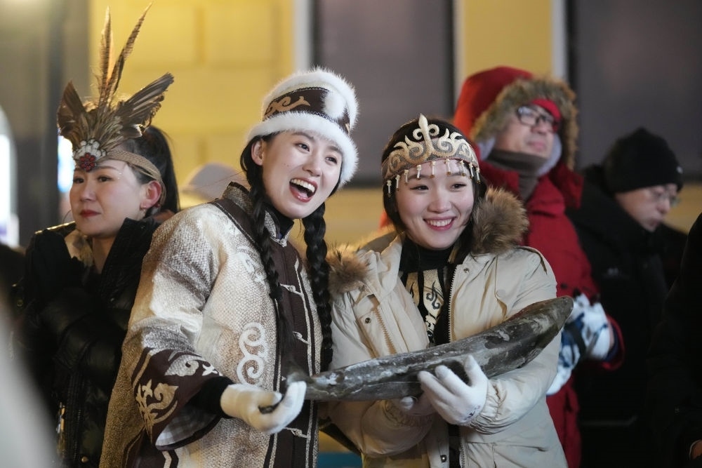 ↑1月6日,戴著魚(yú)皮頭飾的赫哲族姑娘在哈爾濱中央大街上參與家鄉(xiāng)推介活動(dòng)。